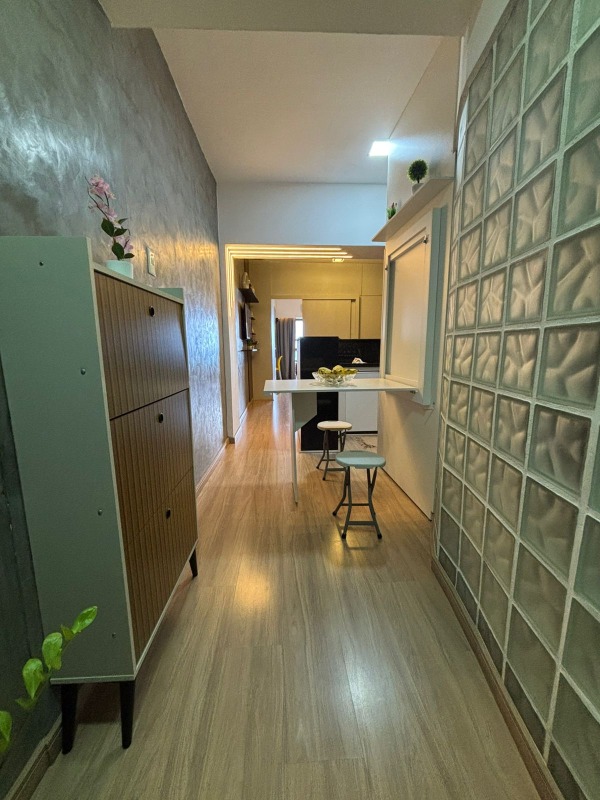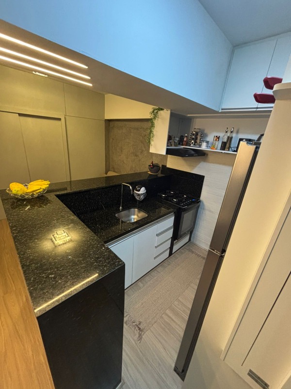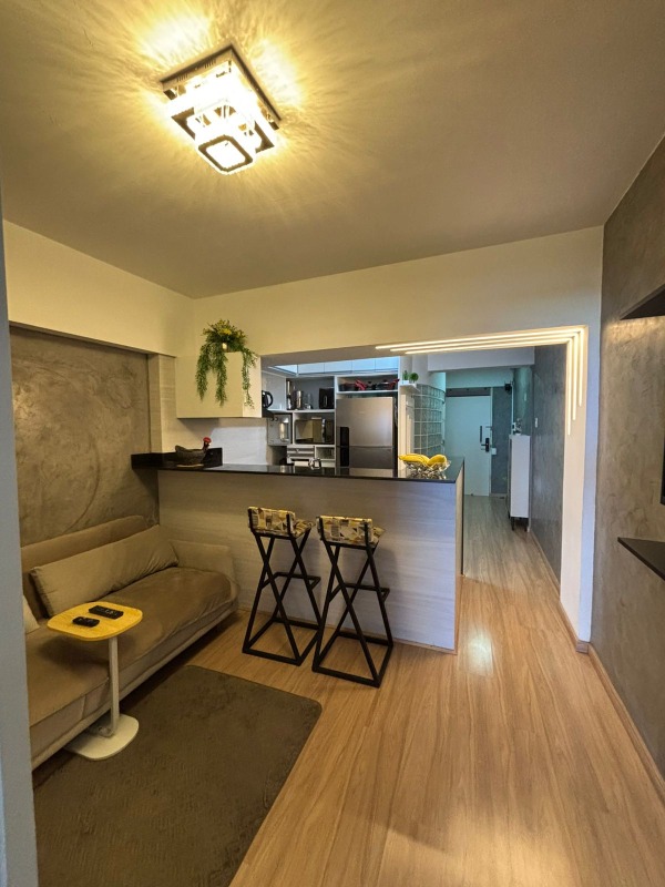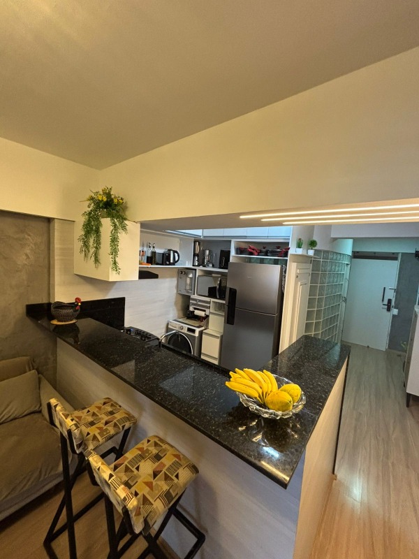 O apartamento, com 59m² de área interna, nascente, reformado e com excelente ventilação, dispõe de sala com cozinha americana, varanda gourmet, 01 quarto, 01 wc com hidro e 01 vagas de garagem.