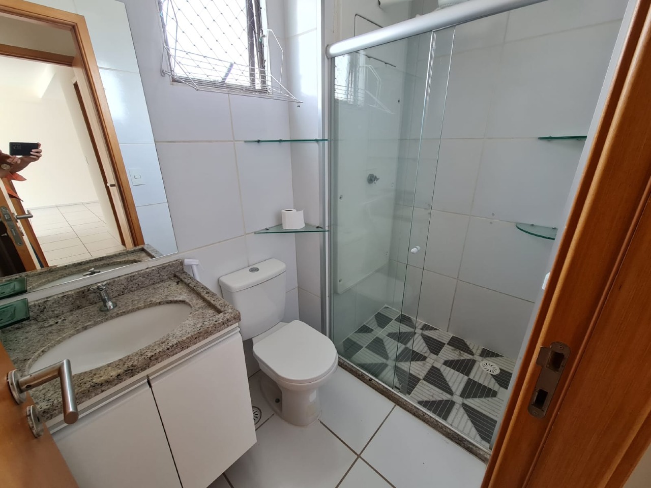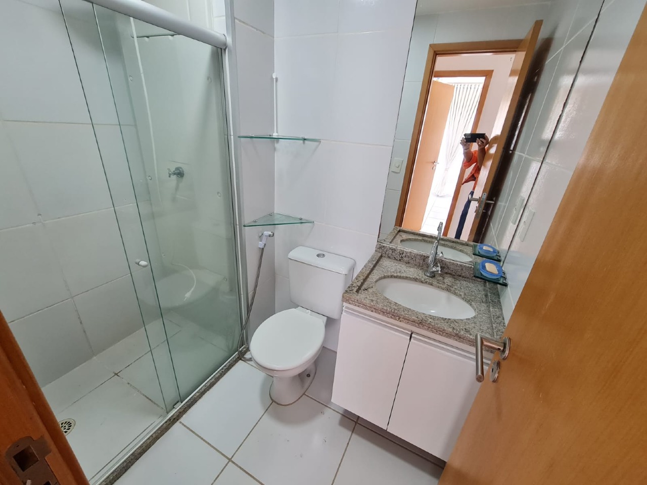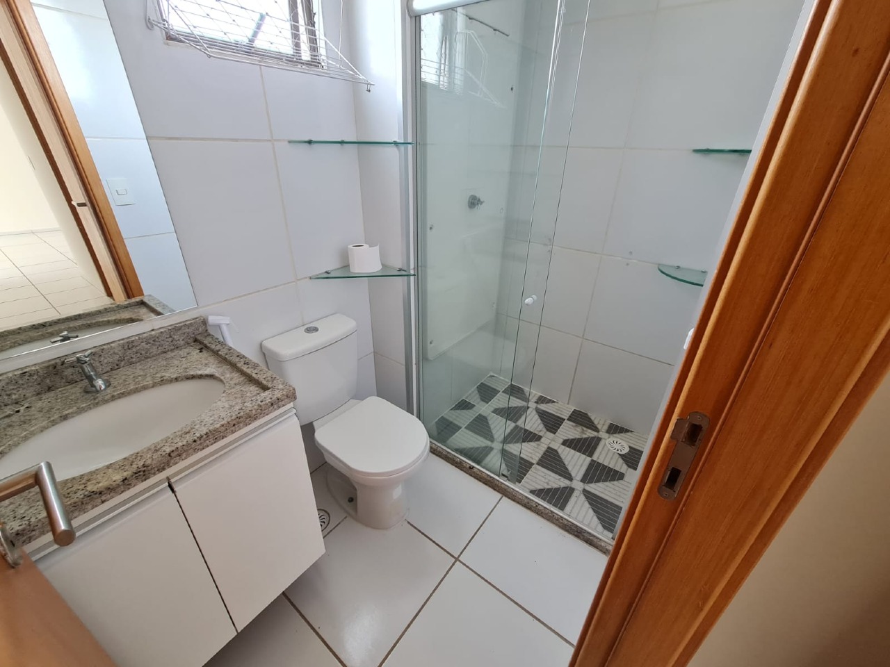 O apartamento, com 54m² de área interna, dispõe de sala para 02 ambientes, cozinha com planejados, área de serviço, 02 quartos com planejados e ar-condicionado, sendo 01 suíte, 01 wc social com armário e box e 01 vaga de garagem.