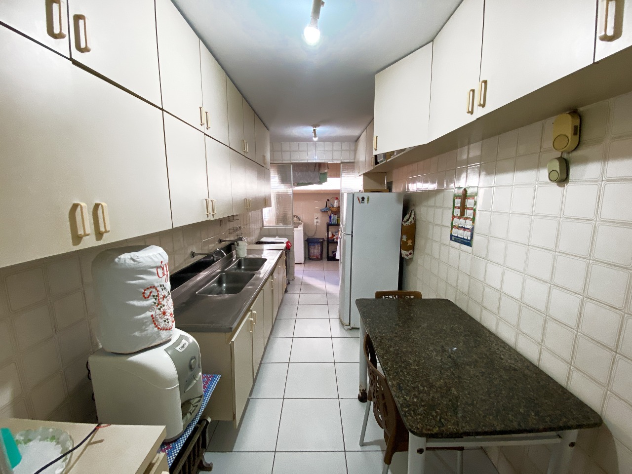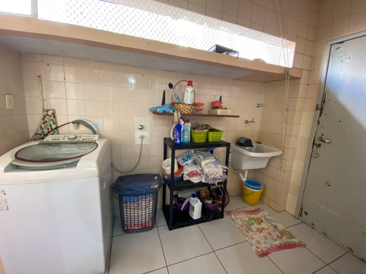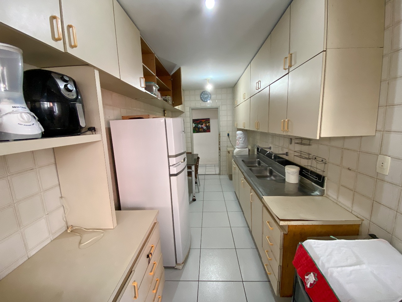 O apartamento, com 140m² de área interna, nascente com excelente ventilação, dispõe de sala ampla para 03 ambientes, varanda com vista para o mar, 03 quartos sendo 01 suite com varanda, 01 wc social, cozinha, área de serviço, dependência completa de serviço e 01 vagas de garagem coberta. O imóvel está com piso em cerâmica, portas e armários embutidos.