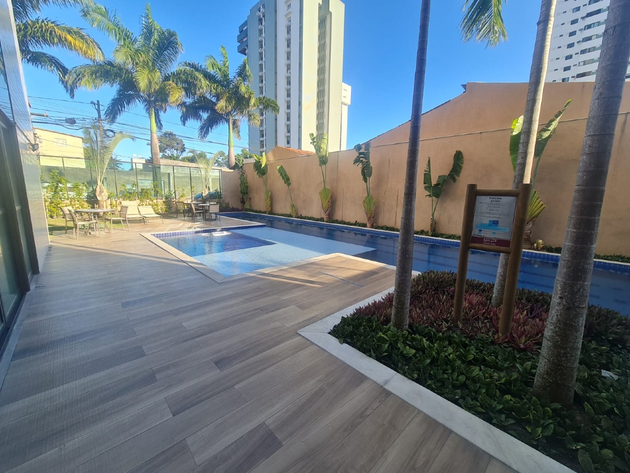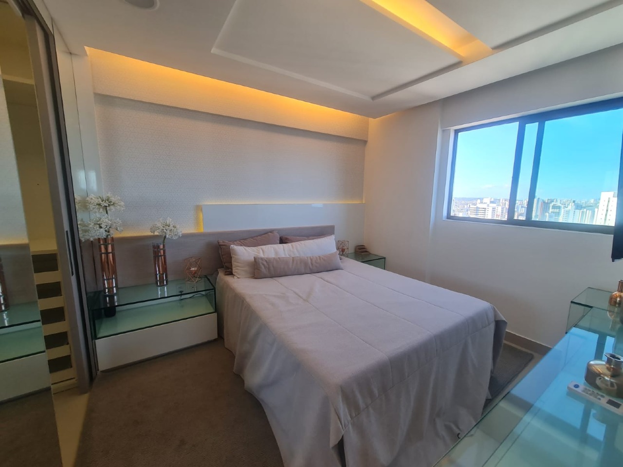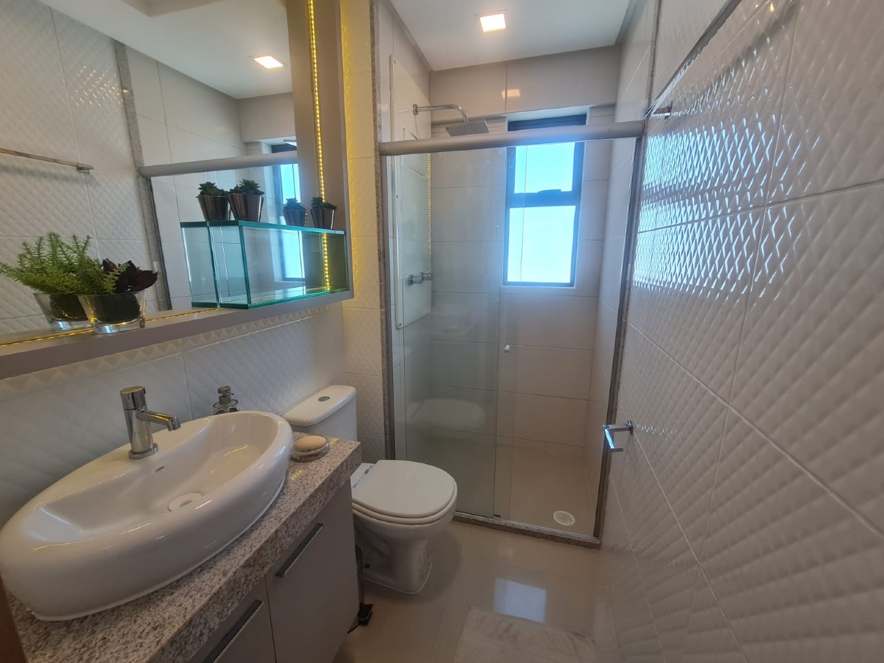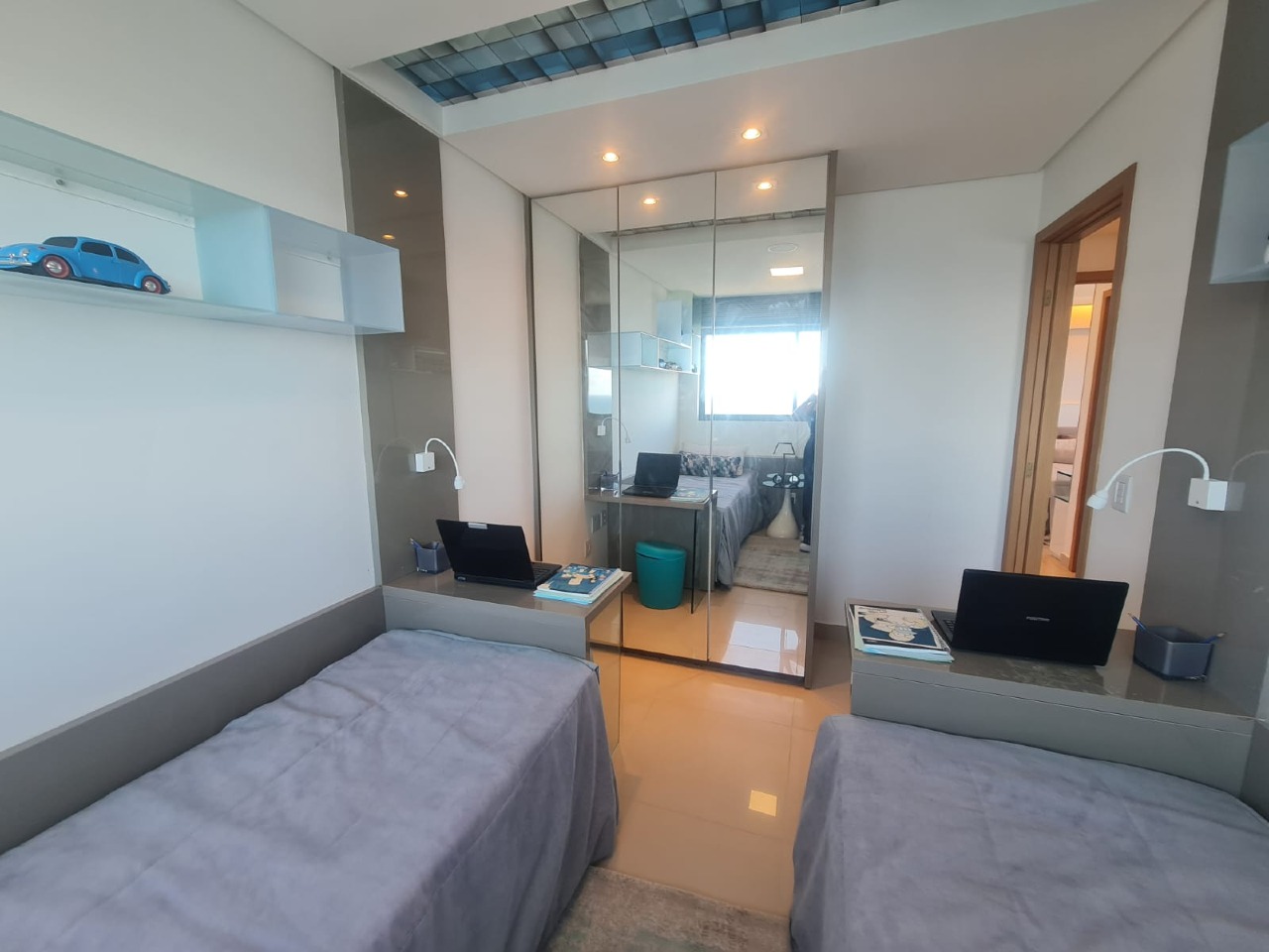 O apartamento com 97m² de área interna, 100% mobiliado com fino acabamento de iluminação e gesso, nascente em andar alto e com uma excelente ventilação, dispõe de sala para 02 ambientes, varanda, cozinha espaçosa com armários, área de serviço, dependência de empregada completa, 03 quartos com planejados, sendo 01 suíte, 01 wc social com armário e box e 02 vagas de garagem cobertas.