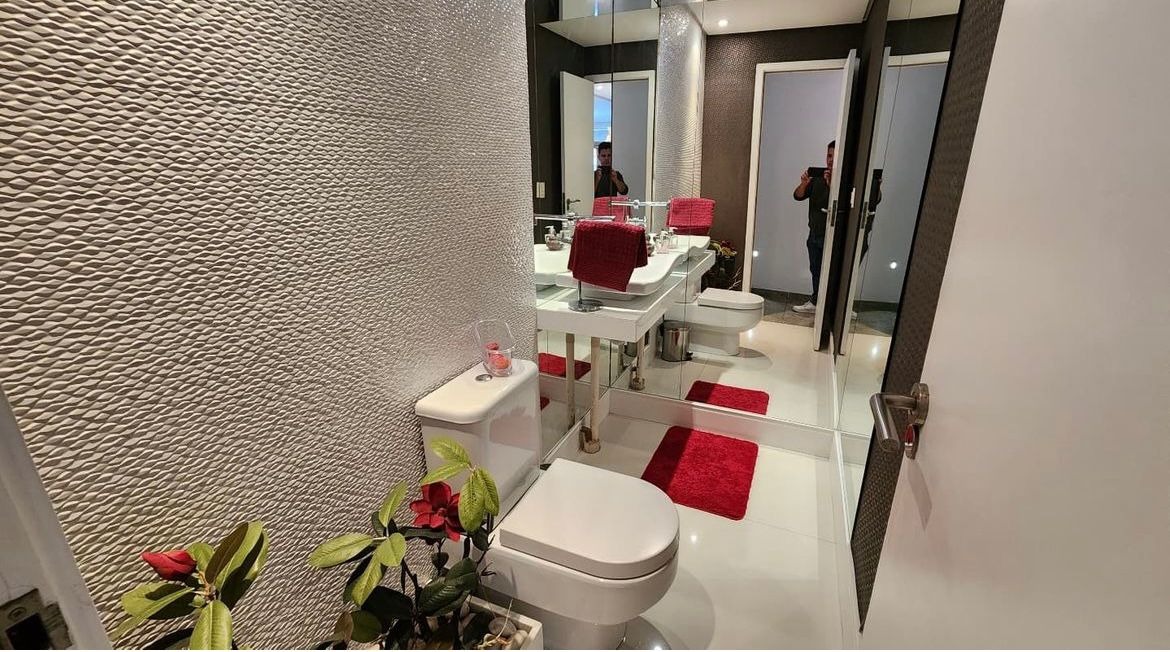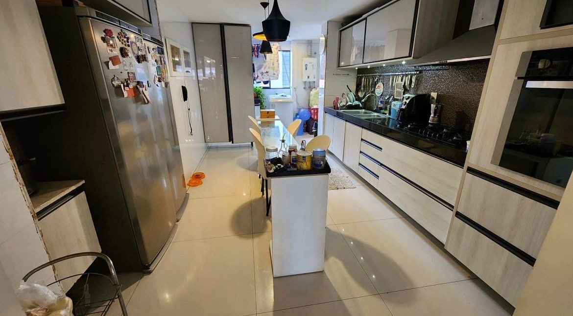 O apartamento, com 153m² de área interna, dispõe de sala para 02 ambientes, cozinha com móveis planejados, área de serviço com dependência completa de empregada, 03 quartos com armários, sendo 03 suítes, 01 wc social e 03 vagas de garagem.