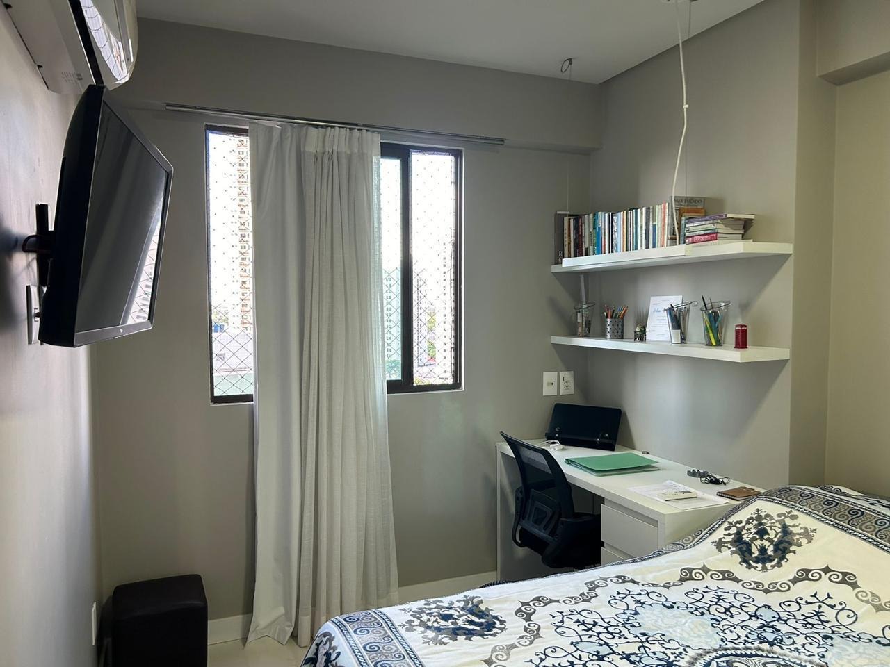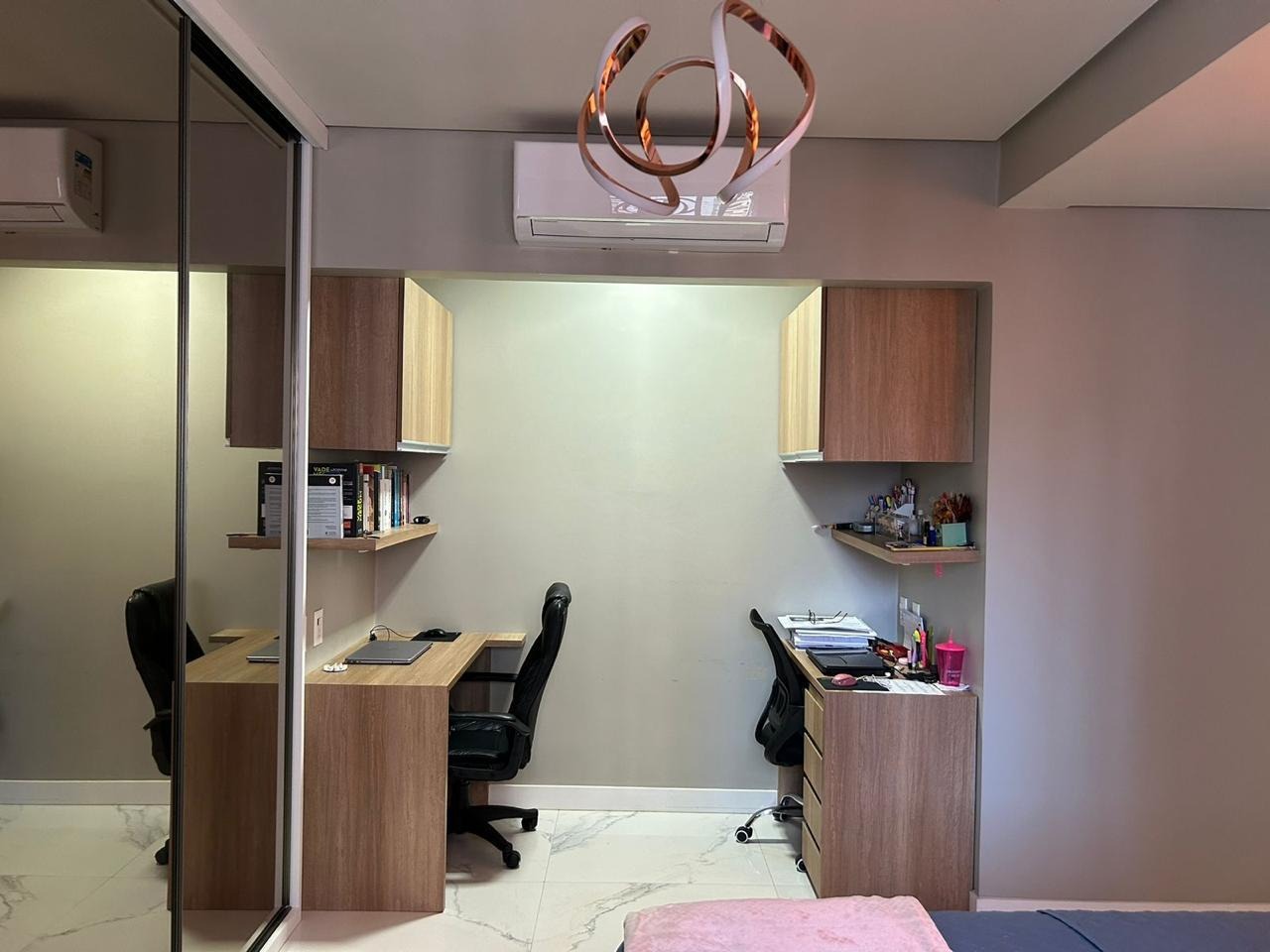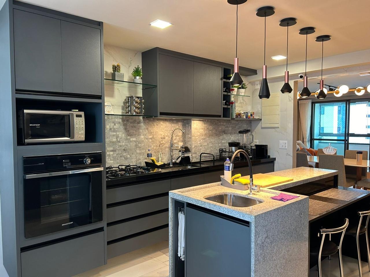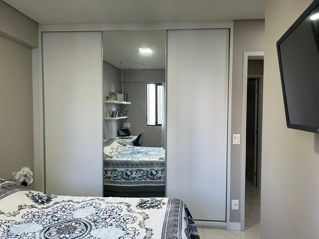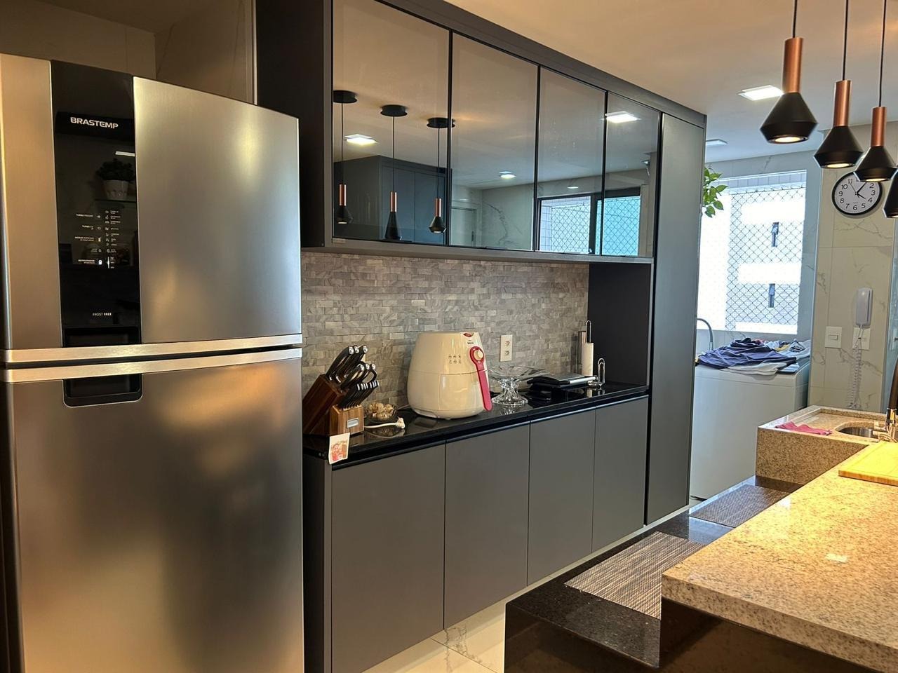 O apartamento, com 113m² de área interna, mobiliado, nascente, boa ventilação, dispõe de sala para 02 ambientes, varanda, cozinha com planejados, área de serviço com dependência completa de empregada, 04 quartos, sendo 02 suítes, 01 wc social e um de serviço, e 02 vagas de garagem.