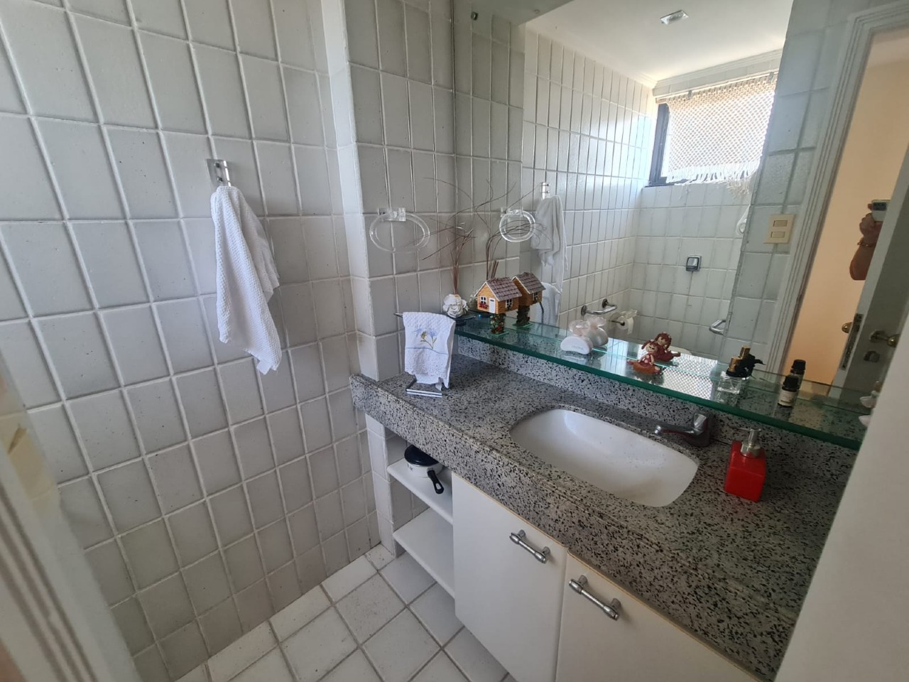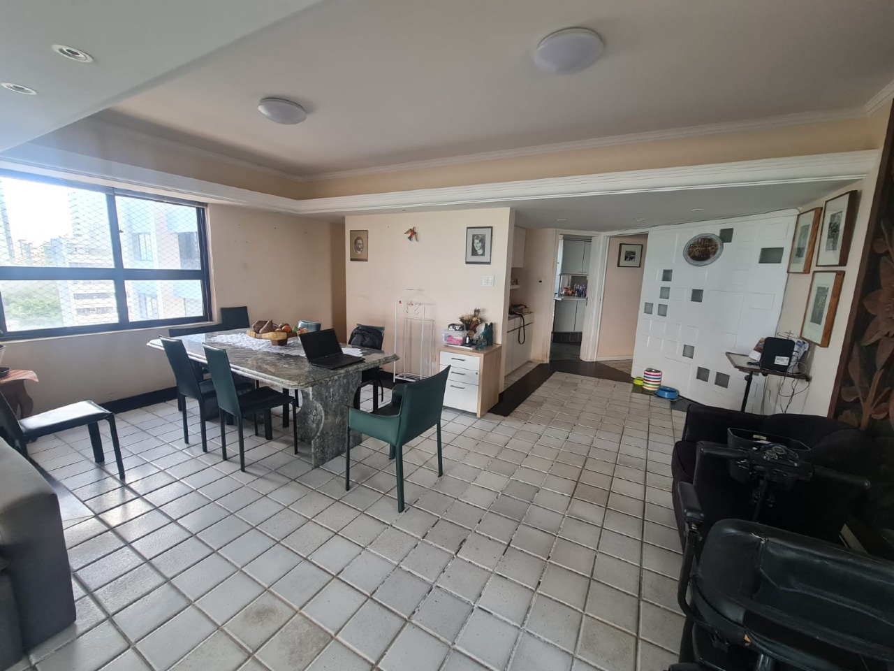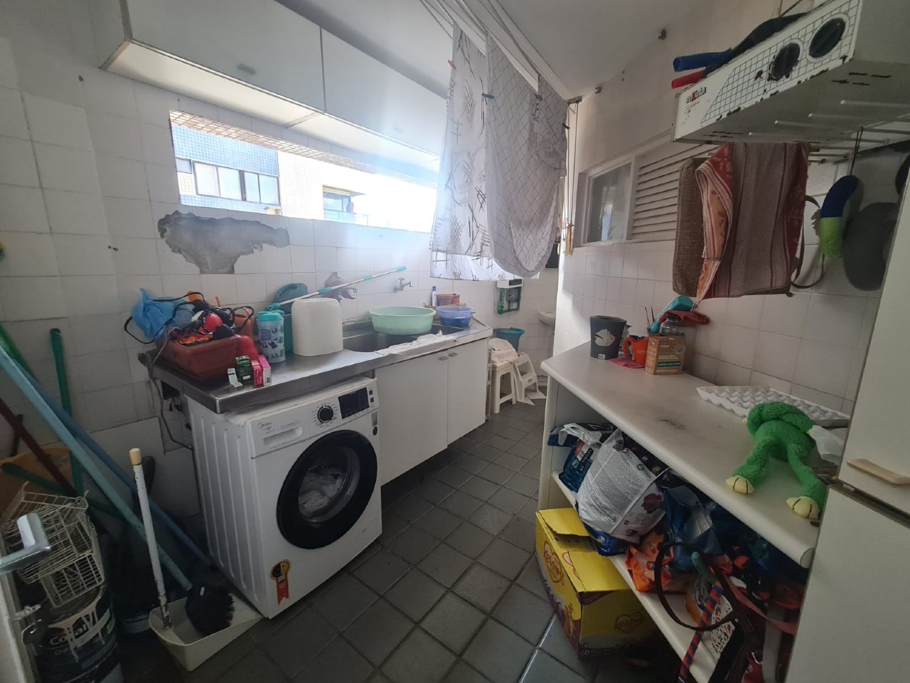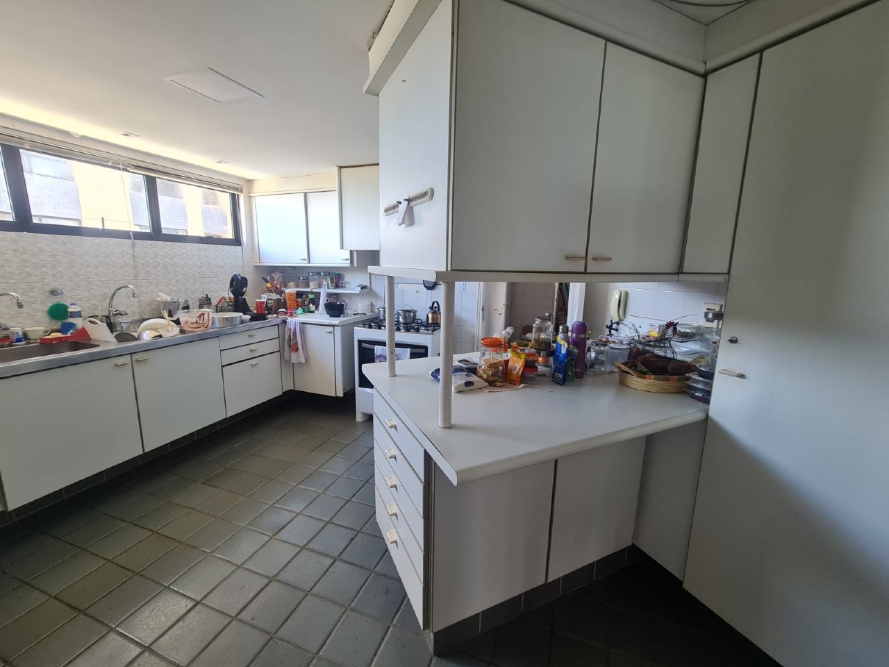 Com 230m², o apartamento é nascente e bem ventilado, com sala para três ambientes, três quartos, sendo 02 suítes, varanda ampla, WC social, cozinha, lavabo, área de serviço, dependência completa de empregada e duas vagas de garagem.